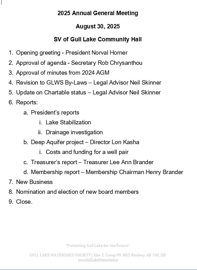 Norval Horner | President of the Gull Lake Watershed Society Presidents Letter to the GLWS Membership – Gull Lake Stabilization The note below comes from
